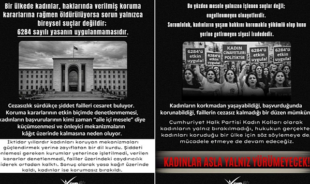 Cumhuriyet Halk Partisi kadın Kolları, art arda yaşanan kadın cinayetlerine ilişkin sert bir açıklama yaptı.Bir günde 6 kadının öldürülmesini “devletin açık ve doğrudan sorumluluğu” olarak nitelendirilen açıklamada, koruma kararlarına rağmen işlenen cinayetlerin münferit değil; uygulanmayan 6284 sayılı yasa, denetlenmeyen koruma kararları ve yıllardır sürdürülen cezasızlık politikalarının sonucu olduğu vurgulandı. “Devlet şiddeti önleme yükümlülüğü yerine getirmiyor.” denilen açıklamada, kadınların yaşam hakkını korumakla yükümlü kurumların görevini yerine getirmediği ve siyasi iradenin bu tablodan kaçamayacağı ifade edildi.Açıklamanın tam metni şöyle:Kadınların ölümü bu ülkede sıradan bir istatistiğe dönüştürüldü.“1 günde 6 kadın öldürüldü” diye okuyup geçtiğimiz şey, bir haber değil; alışmamız beklenen bir cinskırımdır.Kadınların yaşamı sayı değildir. O rakamlara dönüşen kadınların isimleri vardı.Bir hayatları, hikâyeleri vardı. Sevdikleri, kurdukları hayalleri ve ellerinden alınmış bir yaşam hakları vardı.Bu tablo tek bir günün vahşeti değil; uzun süredir kurulan ve sürdürülen bir düzenin sonucudur.Üstelik biz çoğu zaman yalnızca medyaya yansıyan kısmını biliyoruz.Gerçek tablo, görünenin çok daha ötesinde.Kaç kadın cinayeti “şüpheli ölüm” denilerek kapatıldı?Kaçının ölümü “intihar” diyerek geçiştirildi?Kaç dosya hiç gerçek bir soruşturma görmedi?Öldürülen kadınların üçünün uzaklaştırma kararı vardı. Uzaklaştırma kararı olan bir kadının öldürülmesi ise çok açık bir gerçeği ortaya koyuyor:Devlet şiddeti önleme yükümlülüğü yerine getirmiyor.Bir ülkede kadınlar, haklarında verilmiş koruma kararlarına rağmen öldürülüyorsa sorun yalnızca bireysel suçlar değildir; 6284 sayılı yasanın uygulanmamasıdır.Cezasızlık sürdükçe şiddet failleri cesaret buluyor. Koruma kararlarının etkin biçimde denetlenmemesi, kadınların başvurularının kimi zaman “aile içi mesele” diye küçümsenmesi ve önleyici mekanizmaların kâğıt üzerinde kalmasına neden oluyor.İktidar yıllardır kadınları koruyan mekanizmaları güçlendirmek yerine zayıflatan bir dil kurdu. Şiddeti önlemesi gereken kurumlar yeterince işletilmedi, verilen kararlar denetlenmedi, failler üzerindeki caydırıcılık giderek ortadan kalktı. Sonuç olarak yasa kağıt üzerinde kaldı, kadınlar ise korumasız bırakıldı.Bu yüzden mesele yalnızca işlenen suçlar değil; engellenmeyen cinayetlerdir. Sorumluluk, kadınların yaşam hakkını korumakla yükümlü olup bunu yerine getirmeyen siyasi iradededir.Kadınların korkmadan yaşayabildiği, başvurduğunda korunabildiği, faillerin cezasız kalmadığı bir düzen mümkün.Cumhuriyet Halk Partisi Kadın Kolları olarak kadınların yalnız bırakılmadığı, hukukun gerçekten kadınları koruduğu bir ülke için söz söylemeye de, mücadele etmeye de devam edeceğiz. Kadınlar asla yalnız yürümeyecekler.