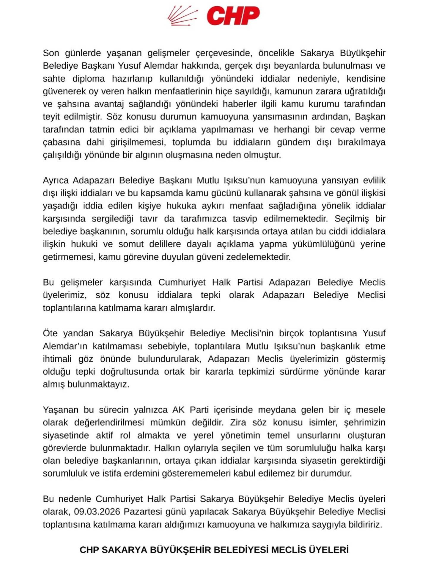 Yusuf Alemdar ve Mutlu Işıksu hakkında son günlerde kamuoyuna yansıyan, yerel, ulusal basında yer alan ve kamuoyunda tartışma yaratan gelişmeler üzerine Cumhuriyet Halk Partisi Sakarya Büyükşehir Belediye Meclis Grubu olarak açıklama yapma gereği doğmuştur diyerek yazılı açıklamada bulunmuşlar ve 09.03..2026 Pazartesi günü meclis toplantısına katılmama kararı almışlardır.
